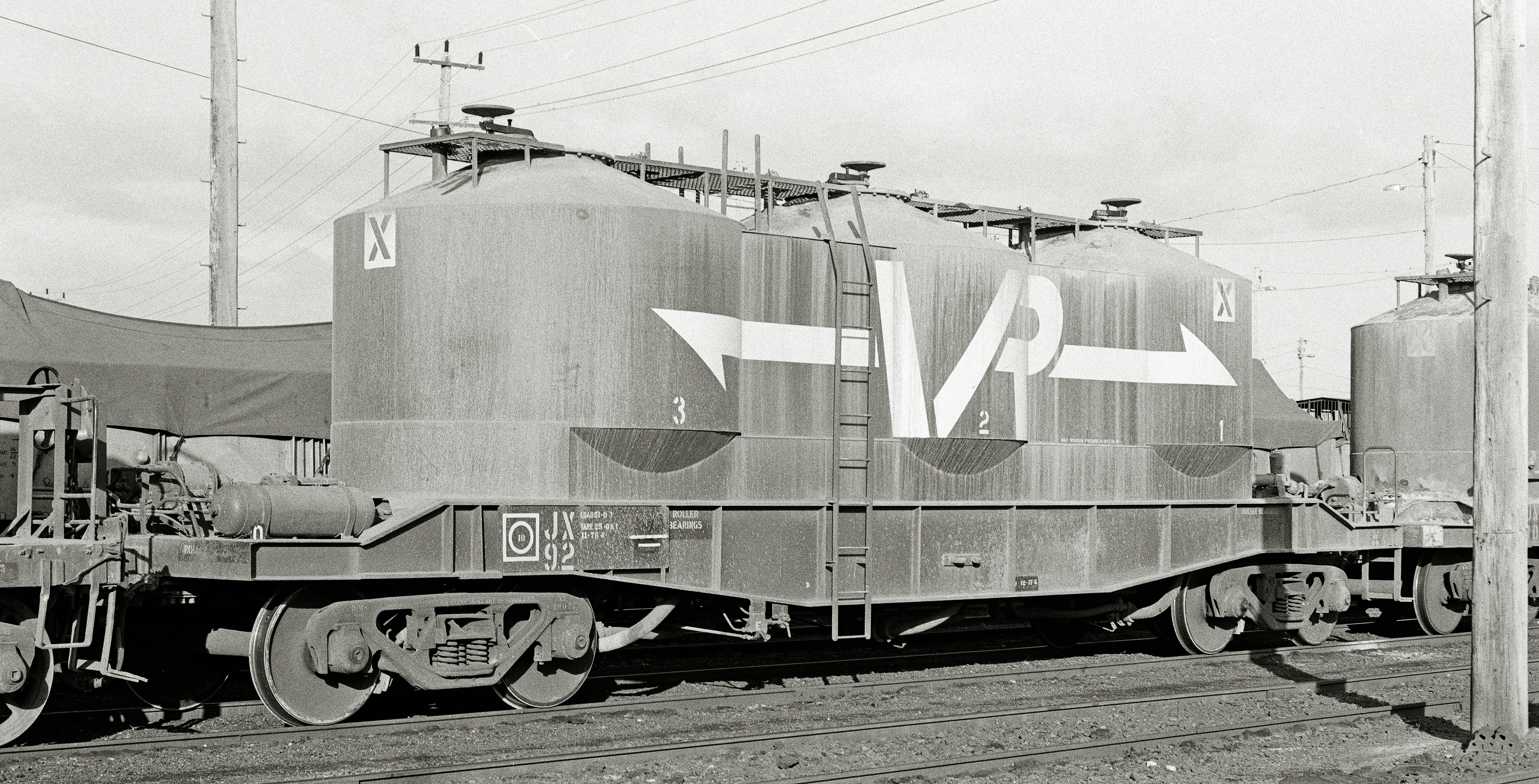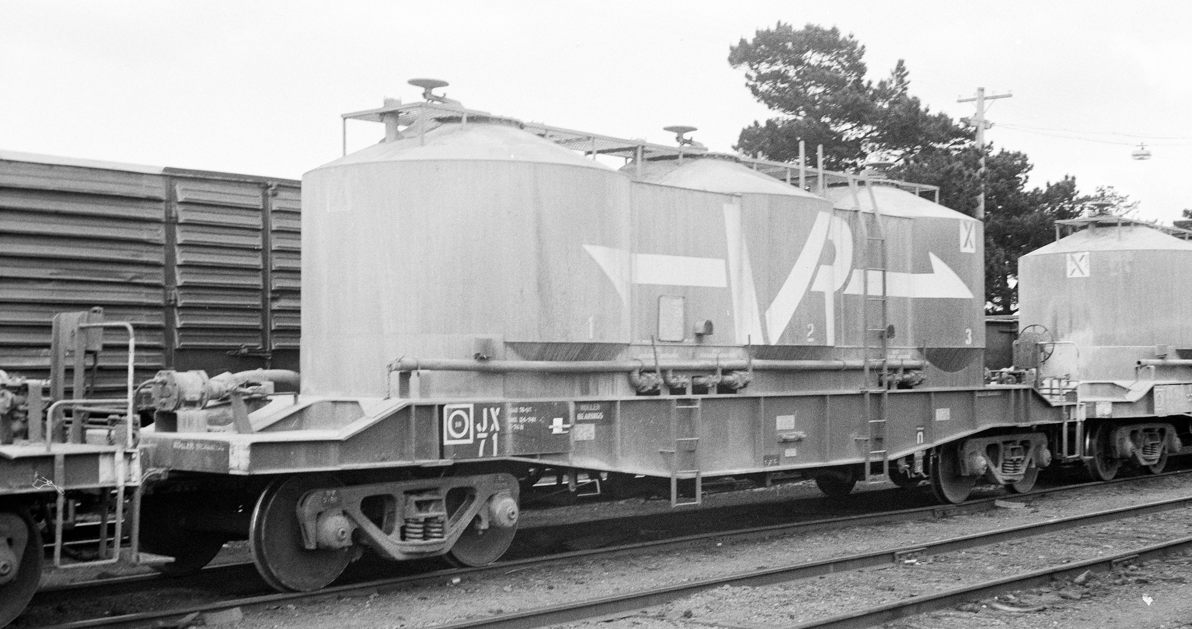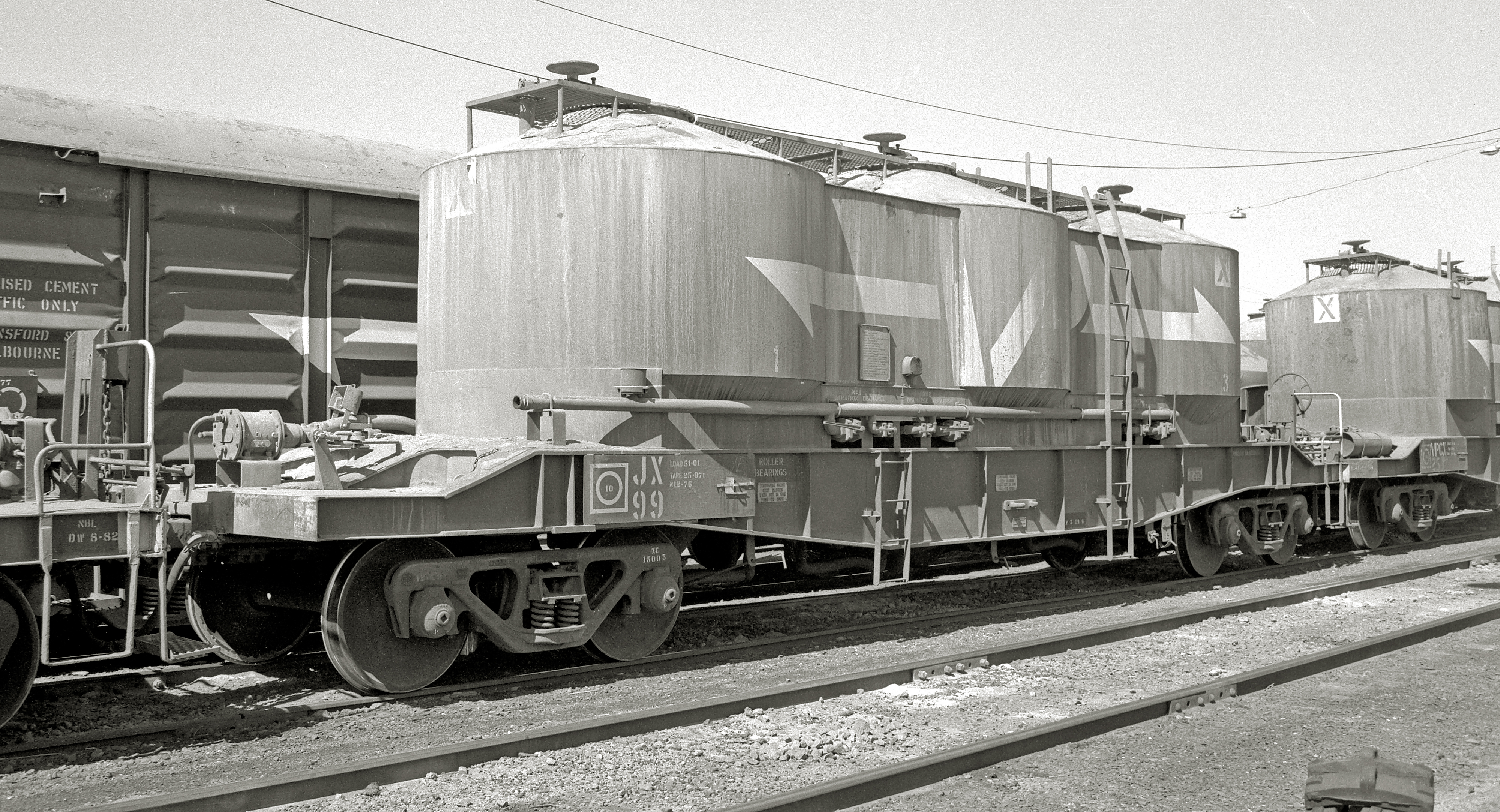 The JX's were built in 5 groups between 1963 and 1982, eventually numbering 158 wagons in the class. Theycarried bulk cement, mainly from Waurn Ponds near Geelong, to many locations around the state. An air supply was required to unload them as they were not gravity discharge. The method of discharge was the same as "Airslide" technology used in the US. In the mid 80's they were used to carry cement to NSW for the building on the new parliament house in Canberra, in this service they ran in blocks of about 15 - 30 wagons. In the 1979 recoding they became VPCX.