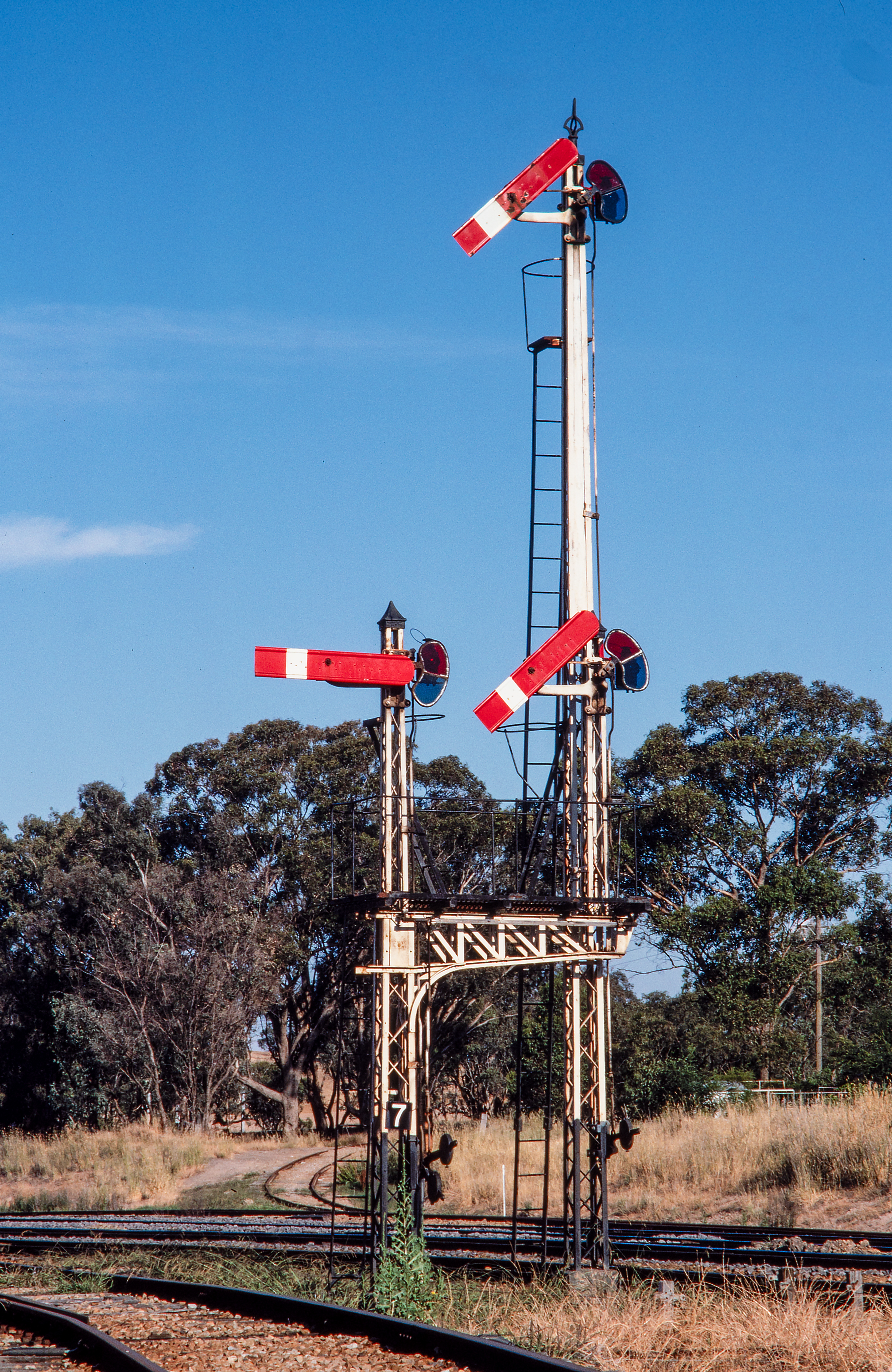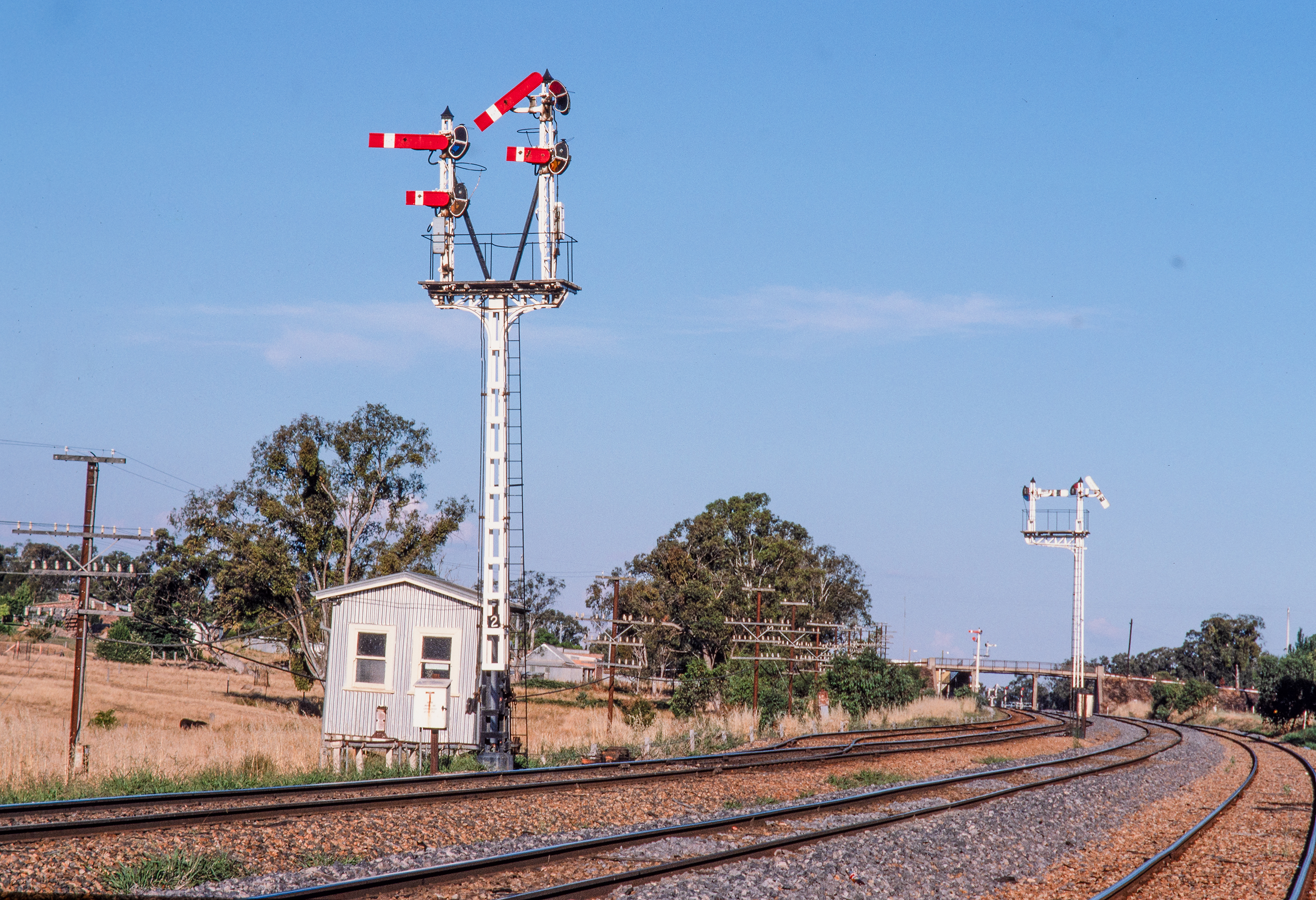The down home arrivals on the left and the up home departures on the right. Glenrowan was at the top of a hill which is why the signals were higher than normal. The Melbourne end turnout was too far from the signal box for lever operation so they were motor operated points, the little hut at the base of the signal contained the equipment. I'm not sure how often the calling on signals were used. The mainline signals in both directions are at proceed as the signal box is switched out. 1987. Photo by Noel Bamford.