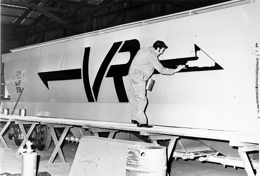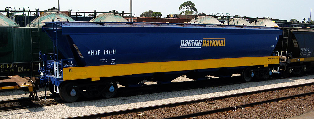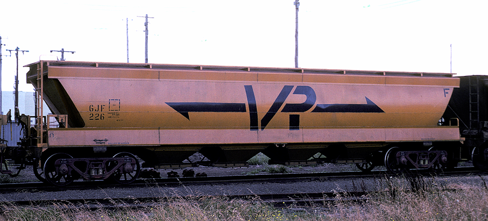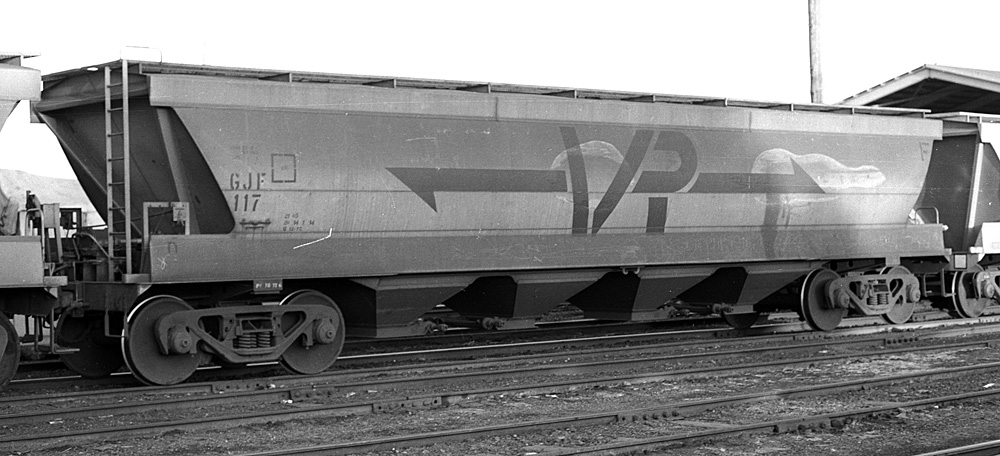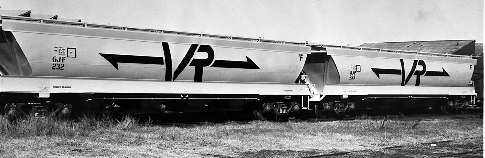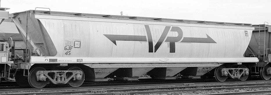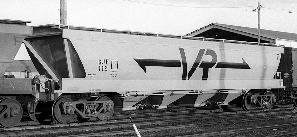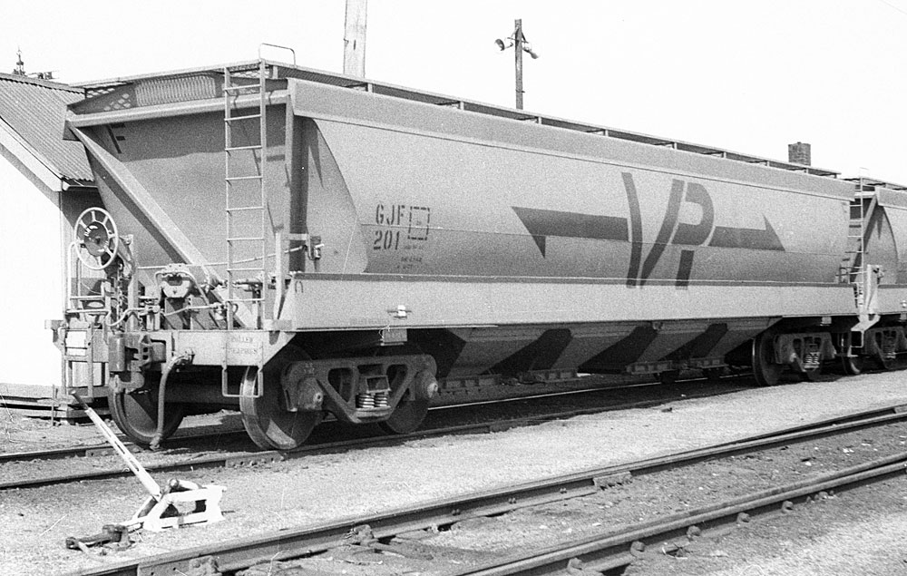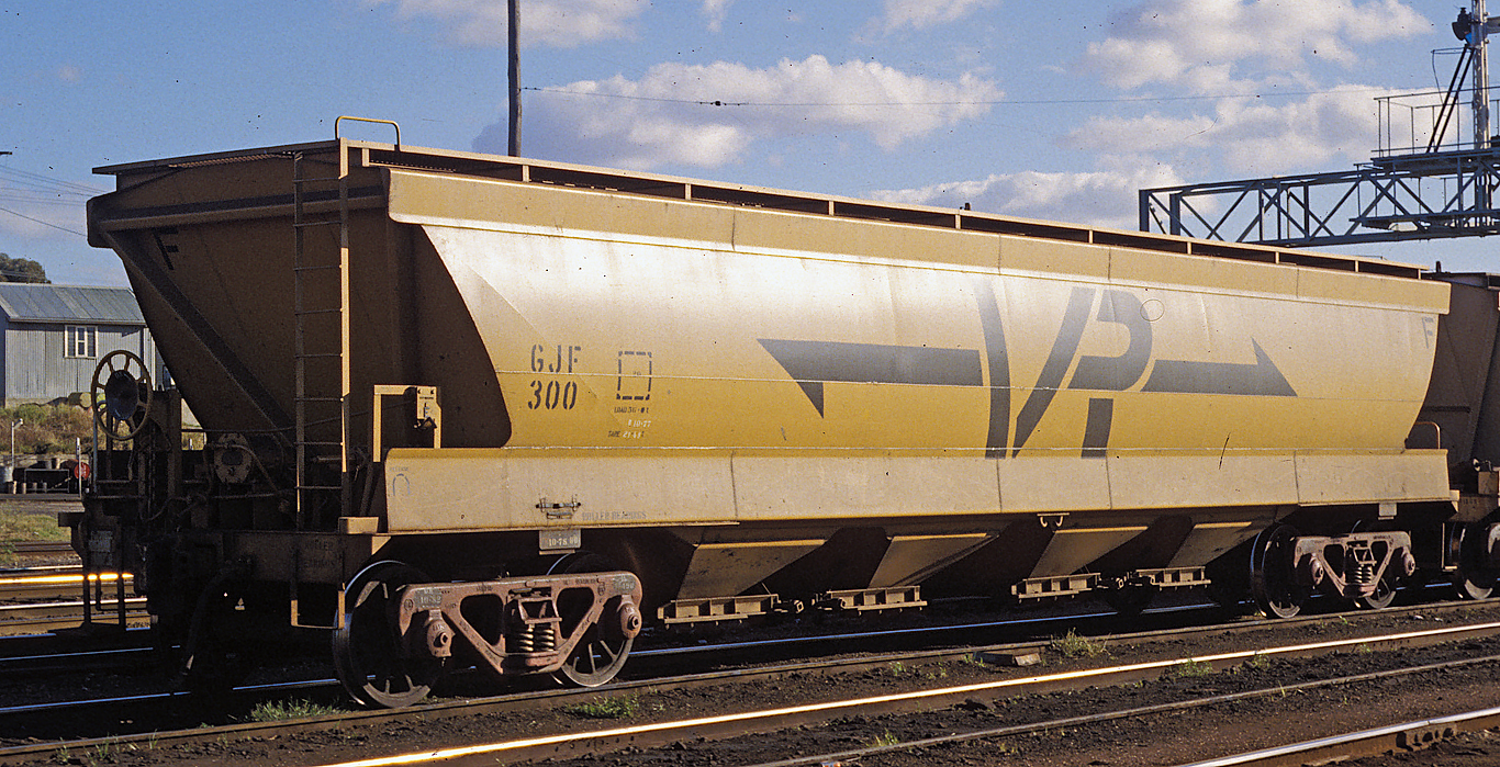 By the early 80's all had been recoded to VHGY Common practice was to use GY's to transport wheat to the big inland terminals at Marmalake (Murtoa) and Dunnoly. Block trains of GJF's would then carry the grain to the seaports of Portland and Geelong for loading into ships. Some branchlines could not carry fully loaded GJF's. They carried 55 tons of grain compared to a GY which could only carry 22 tons Later, hoppers to a similar design were built as VHGY and VHHF. |