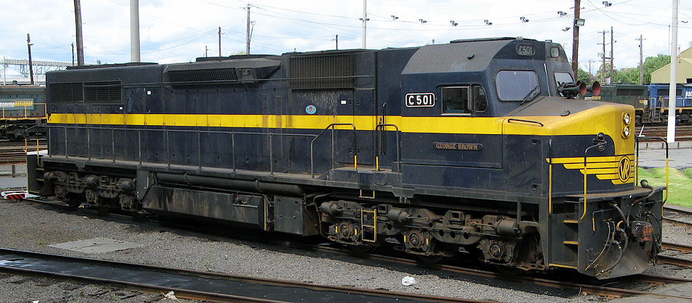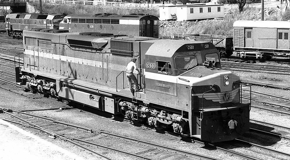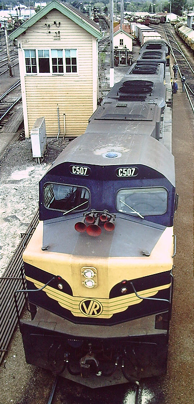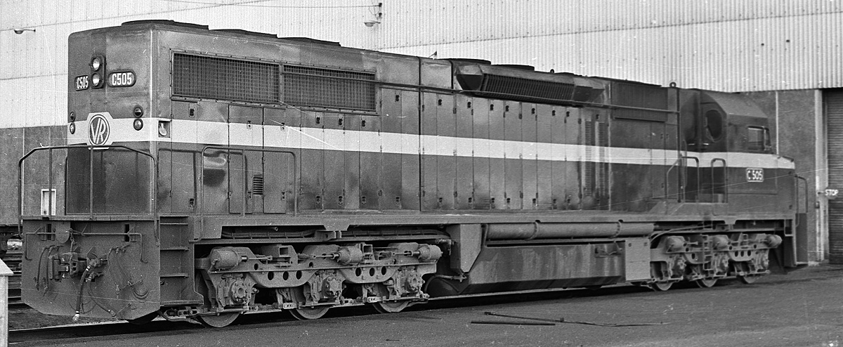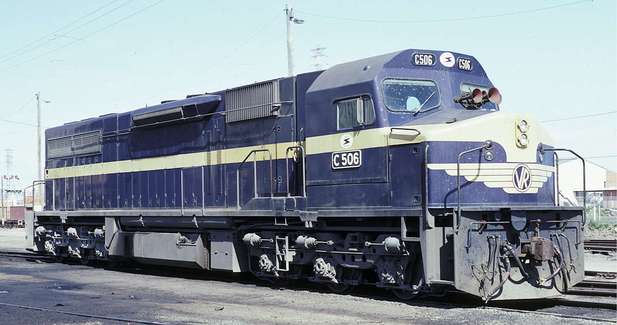 The 10 C class were the last locos delivered in VR's classic blue and gold color scheme, they were also VR's first turbocharged locos. Mechanically they were an SD40 (not SD40-2) When introduced their weight meant that they were very restricted as to the lines they could run over. C 501 - 504 were put on the SG running between Melbourne and Albury,C 505 - 510 were kept on BG and ran Melbourne to Serviceton interstate express freights. On 3/8/1979 C 505 and C 506 operated a freight all the way from Melbourne to Adelaide thus ushering in through working of locos between Victoria and South Australia. Upon the formation of National Rail all of the C class were transfered to National Rail (1995) where they ran for a little while before they were removed from traffic due to the arrival of the NR class locos. 2 C's (505 & 508) were later re-issued to traffic as NR shunters in Melbourne Over the years the C's underwent many external and internal changes including: