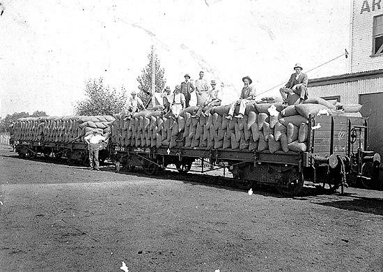 Undated photo of a QR minus its sides, loaded with bagged wheat.