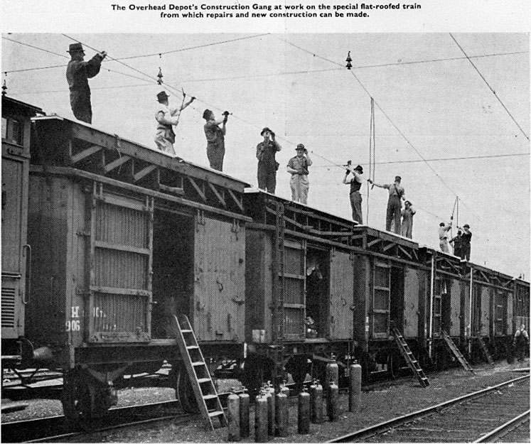 VR maintained an overhead train which was used to replace and work on the overhead wire. A group of these wagons was bracketed by two wagons carrying reels of overhead wire. The wire was attached to a stauntion and as the train pulled forward the wire would feed out and workers atop these wagons would secure the wire to the stauntions. They were converted from F horseboxes in 1951 for the Traralgon electrification project.Contact wire only needs to be replaced in 30 + year cycles so the overhead train spent long periods of inactivity stored at North Melbourne workshops.