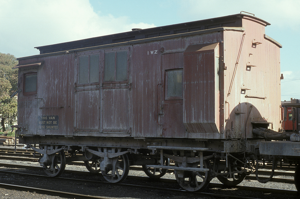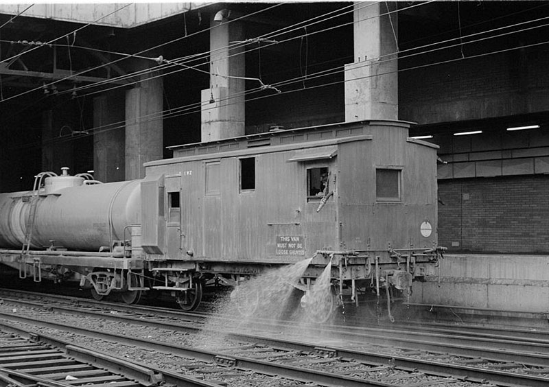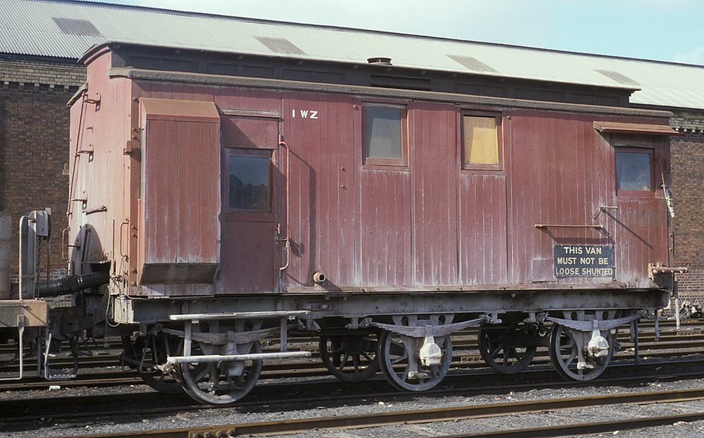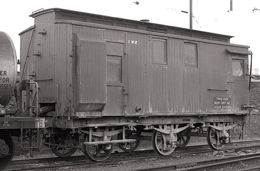 This interesting vehicle was converted from horsebox F 25 in Dec. 1954, at this time it was coded as HZ 1. In March 1959 it was recoded to WZ 1. Its purpose was to spray weeds. It was attached to the rear of a rake of WA tank wagons that contained water and pipes brought the water up to the van where the weed kiiler was added, there were control valves and nozzles for the operator to direct and control the spray. The train was known as the "Weedex" train. It is recorded as cut up in 1996 but the 6 wheel underframe is now in the possession of the Seymour Historical Society. |